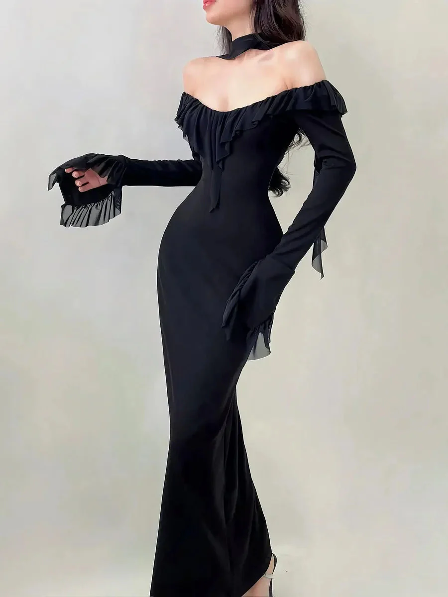 'Midnight Poem' Goth Elegant Ruffle Sheath Midi Dress