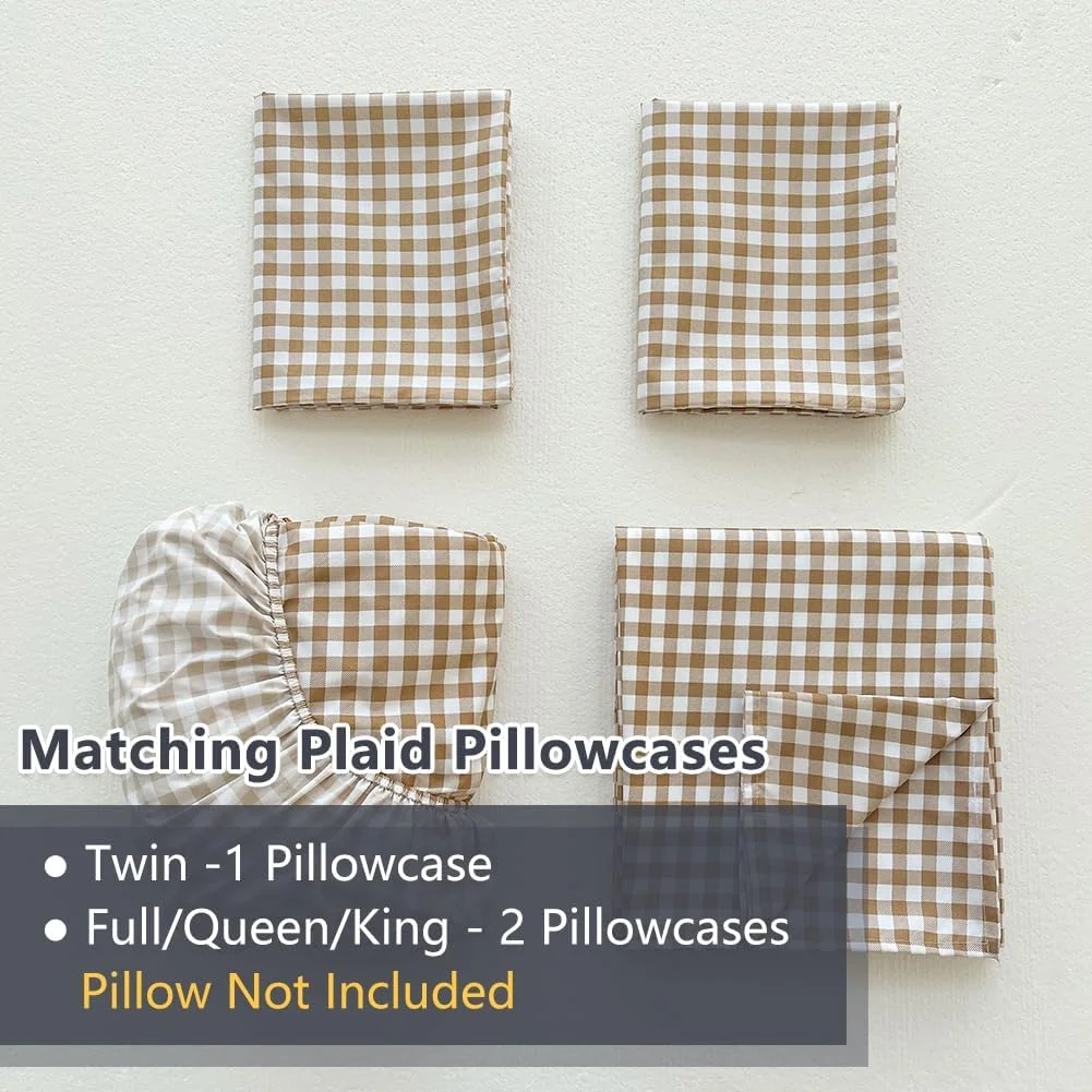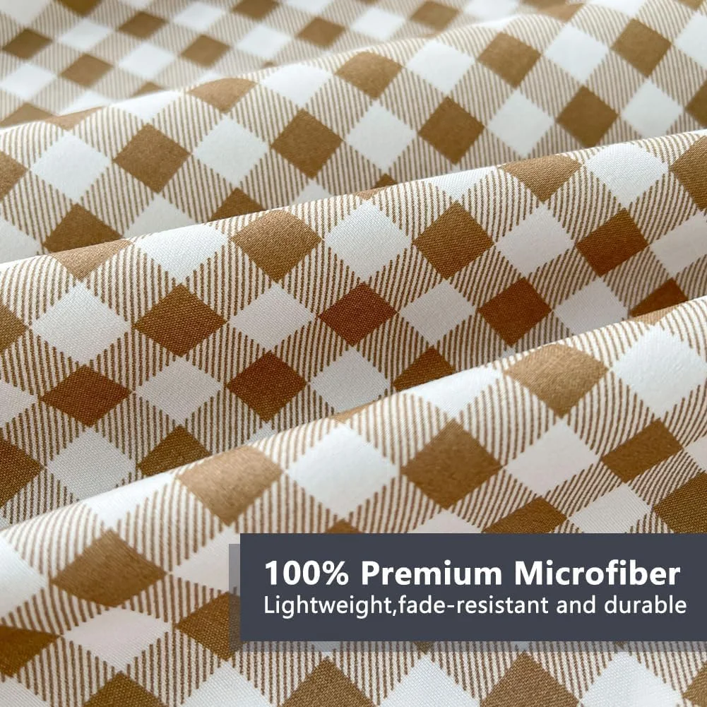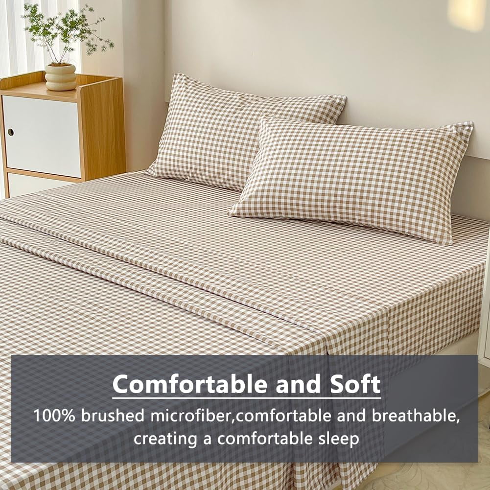 Full Size 4-Piece Tan Gingham Sheet Set - Soft Brushed Microfiber, Taupe Plaid & Brown Grid Design with Deep Pockets