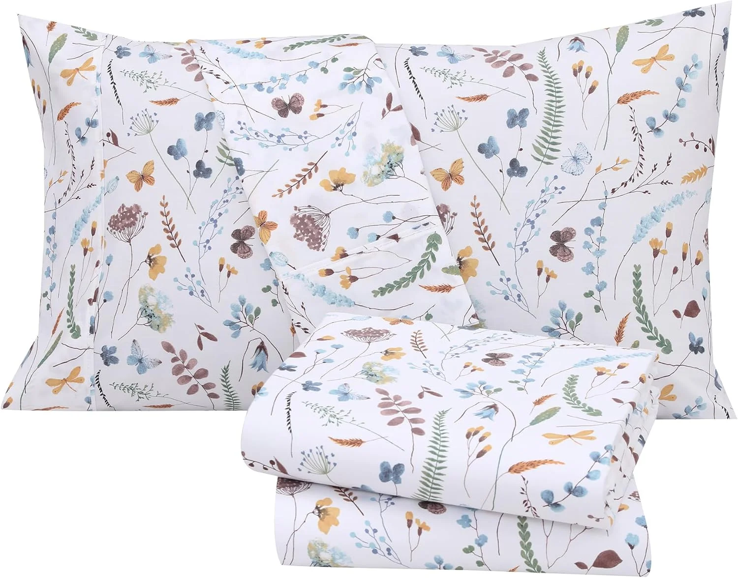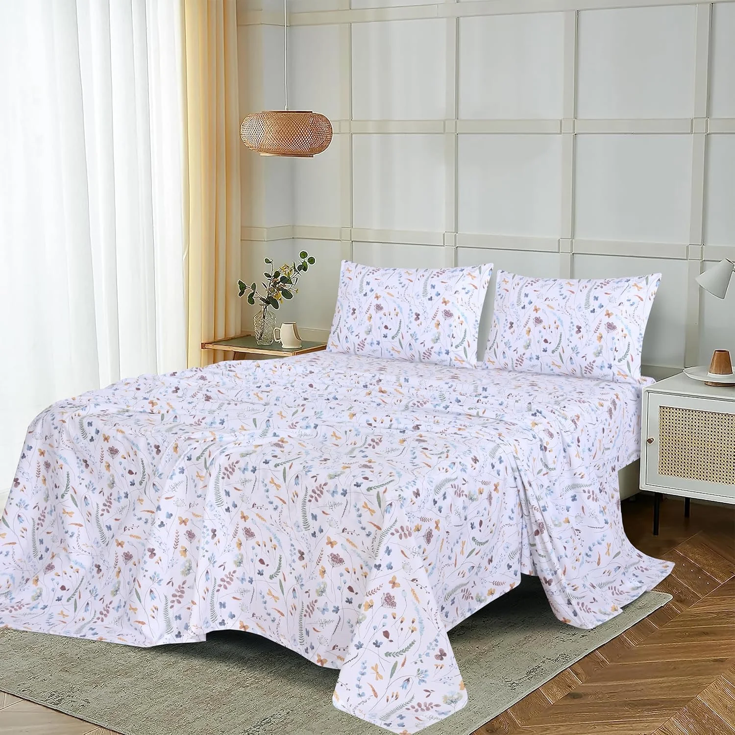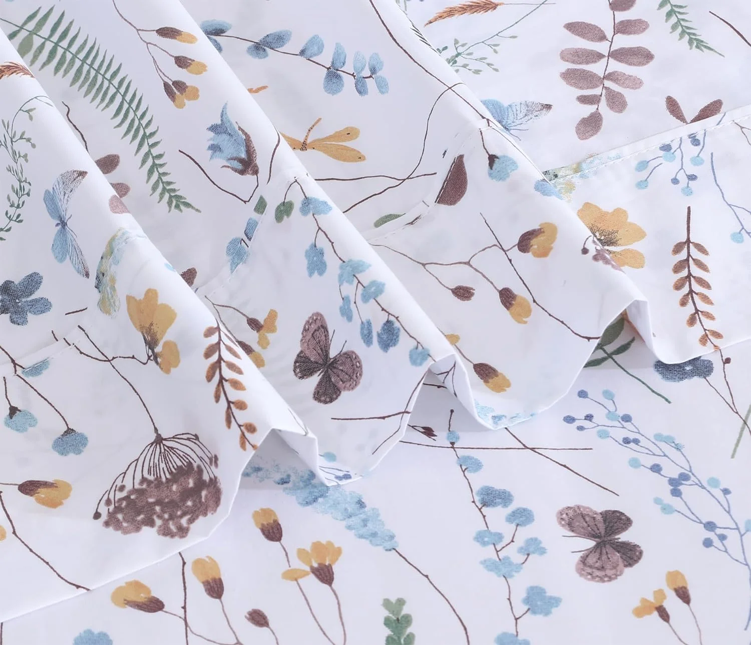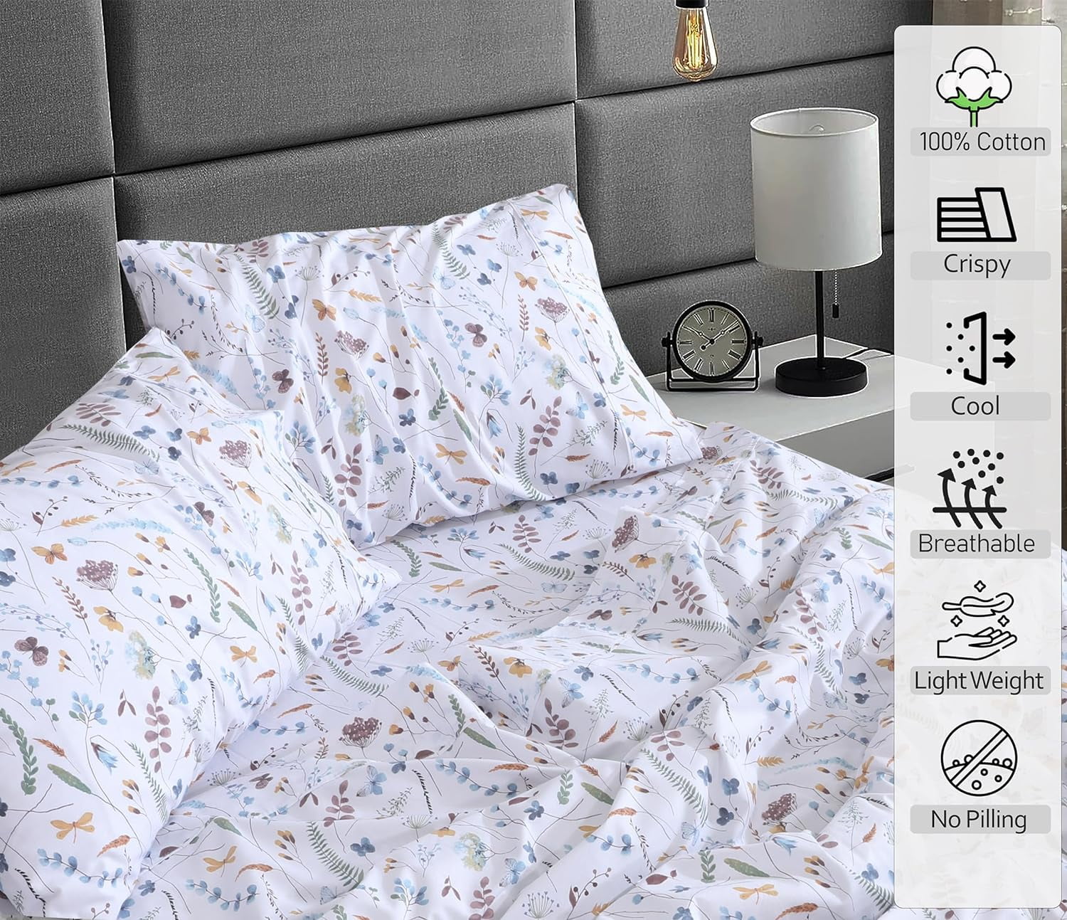 King Size Sheet Set, 100% Cotton Percale 4-Piece Bedding, Soft & Breathable Deep Pocket 16" Hotel Style Cooling Sheets, Classic Fern Floral Design