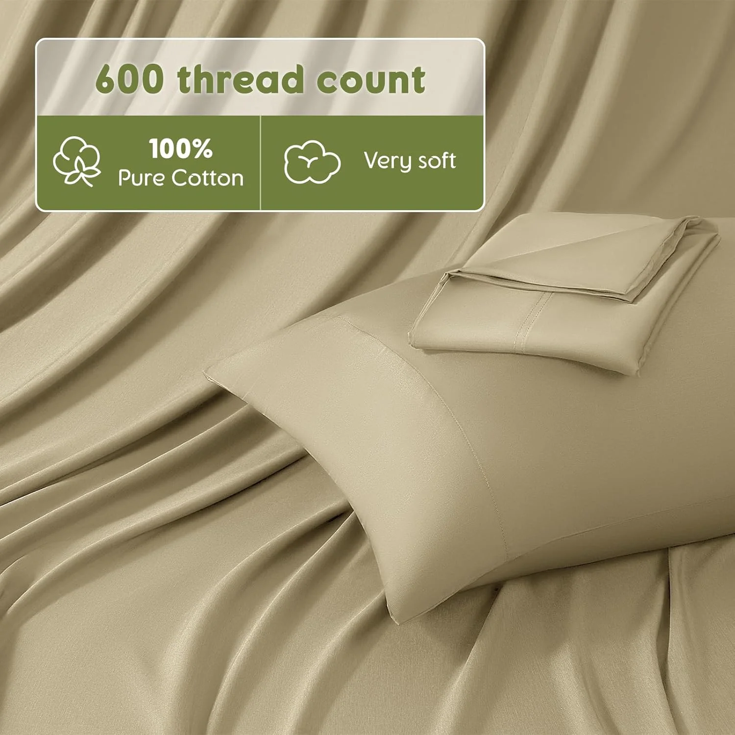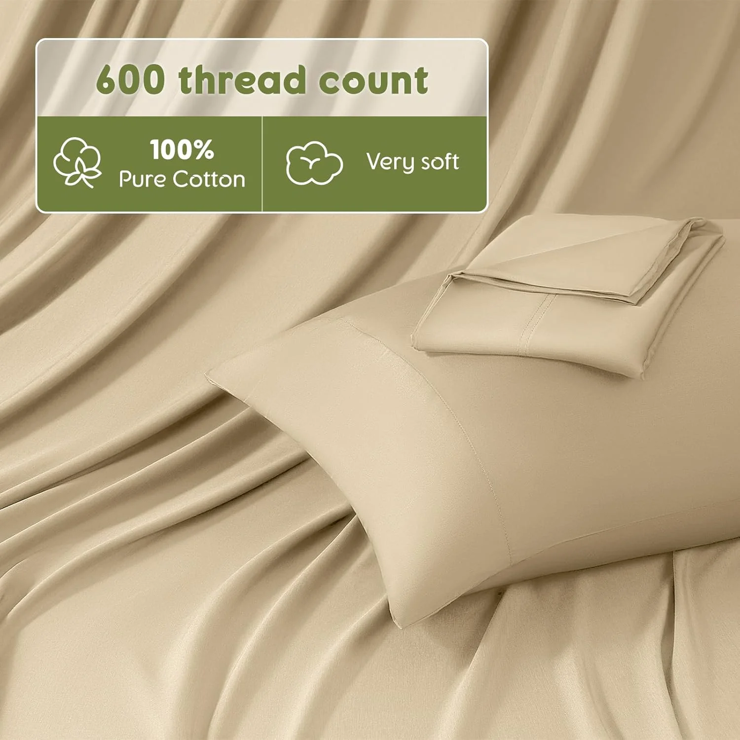 100% Egyptian Cotton Sheets King Size - 600 Thread Count, Luxury Hotel Quality Bedding Set, Soft Cooling Sateen Weave Bed Sheet Sets, 16" Deep Pocket - 4 PC(Beige,King)